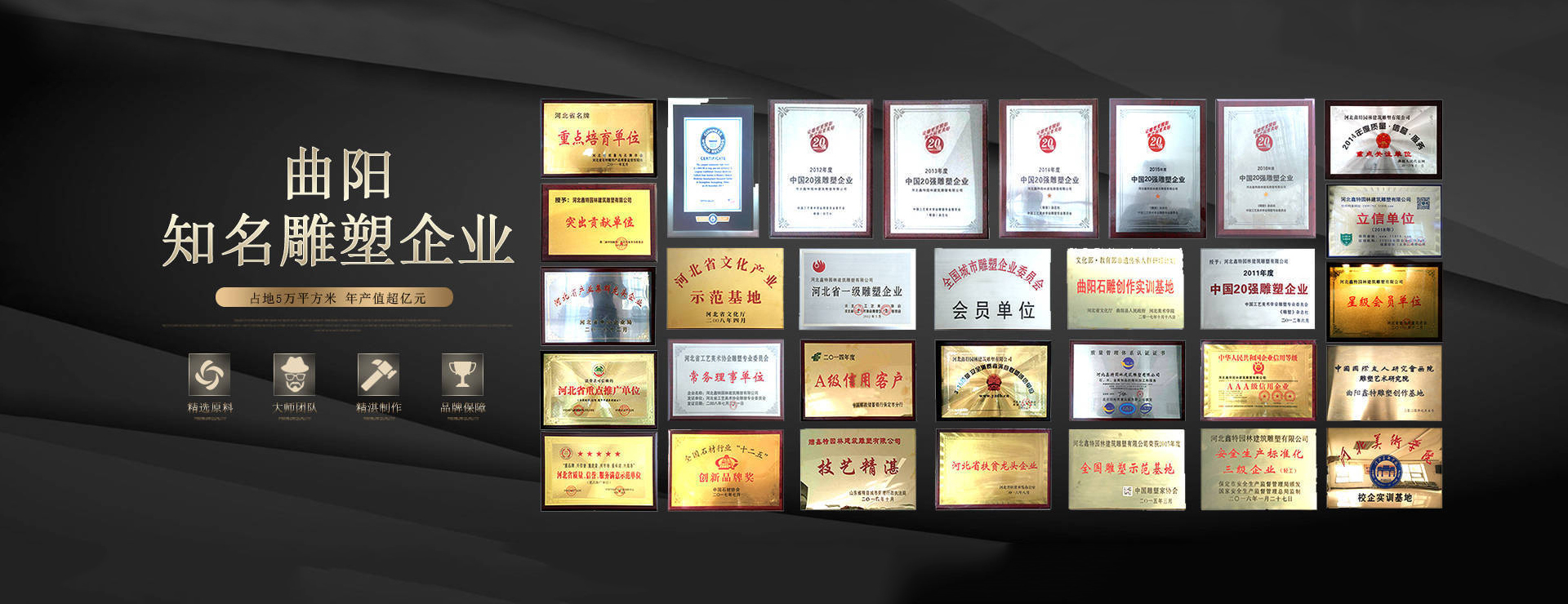 河北鑫特園林建筑雕塑有限公司成立于2002年,是中國(guó)雕刻之鄉(xiāng)——曲陽(yáng)縣的一家實(shí)力雄厚的大型雕塑公司,公司占地面積50000+平方米,年產(chǎn)值超過(guò)億元,具有雕塑總承包一級(jí)資質(zhì)、古建筑三級(jí)資質(zhì)、市政公用工程施工總承包三級(jí)資質(zhì)。